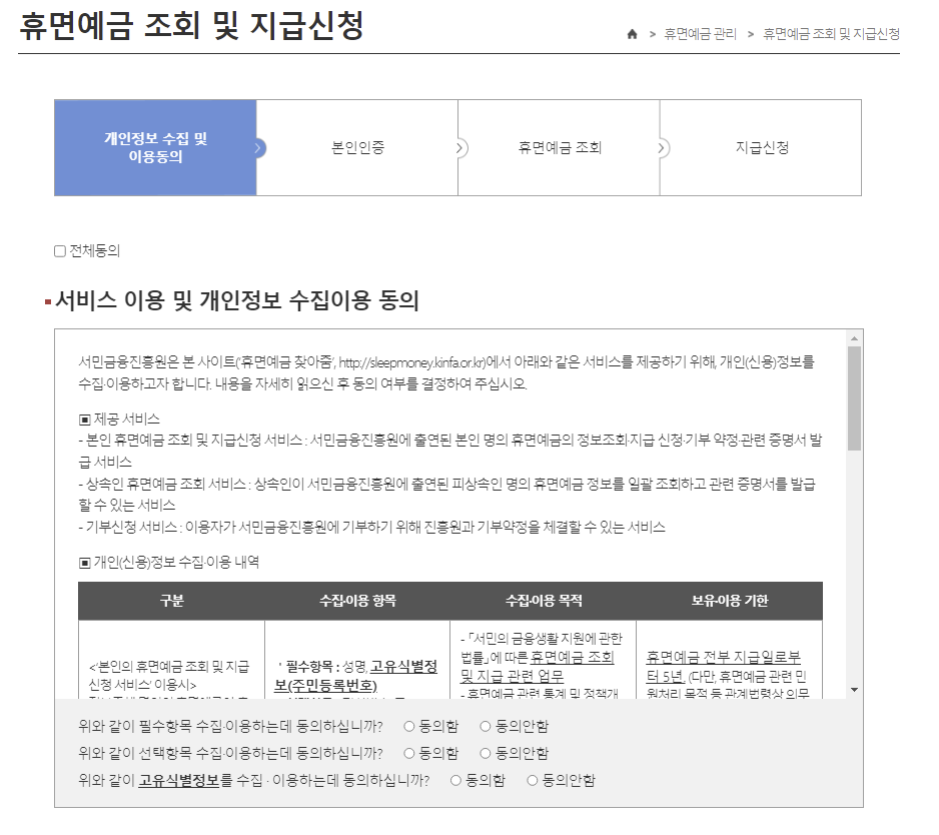 1. 서민금융진흥원 홈페이지에 접속하여 <휴면예금 통합 조회> 선택