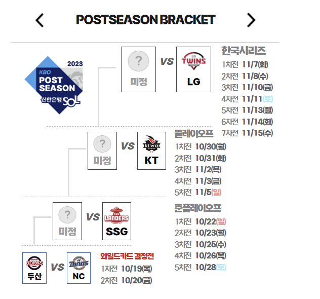 준플레이오프는 10월22일부터 시작되며, 플레이오프전은 10월 30일부터 개최됩니다. 한국시리즈는 11월 7일에 시작될 예정입니다.